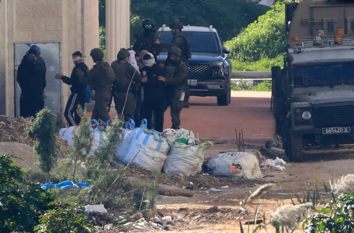 Israeli soldiers frisk and detain blind-folded Palestinians. Photograph: Alaa Badarneh/EPA