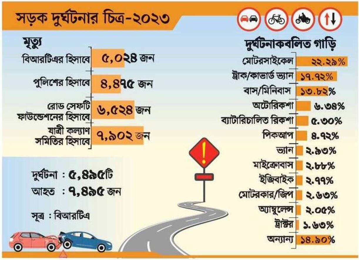 সড়ক পরিবহন খাতের নিয়ন্ত্রক সংস্থা বাংলাদেশ সড়ক পরিবহন কর্তৃপক্ষের (বিআরটিএ) তথ্য অনুযায়ী, গত বছর প্রতিদিন সড়কে প্রায় ১৪ জনের মৃত্যু হয়েছে।